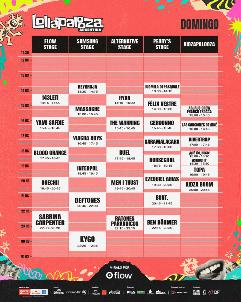 La última jornada tendrá la misión de cerrar con broche de oro una de las ediciones más potentes del festival en Argentina en lo que a lineup refiere. Rompiendo el hielo desde las 13:45 se presentarán la banda de rock bonaerense Reybruja y la DJ argentina Ludmila di Pasquale, seguidos por 143leti, RYAN y Félix Vestre, en un arranque que marcará el espíritu diverso del día. A las 15:00 volverán a reunirse los rockeros frente al Escenario SAMSUNG para ver al emblema nacional Massacre, y a las 15:45 será el turno de The Warning en el Alternative. Para quienes prefieran un recorrido más urbano, la cita estará en Perry’s con Cerounno (15:45) y luego Saramalacara (17:00). Si el plan es pop, Yami Safdie subirá al Escenario FLOW a las 15:45; y si la brújula apunta hacia el post-punk, el Escenario SAMSUNG recibirá a Viagra Boys a las 16:45.